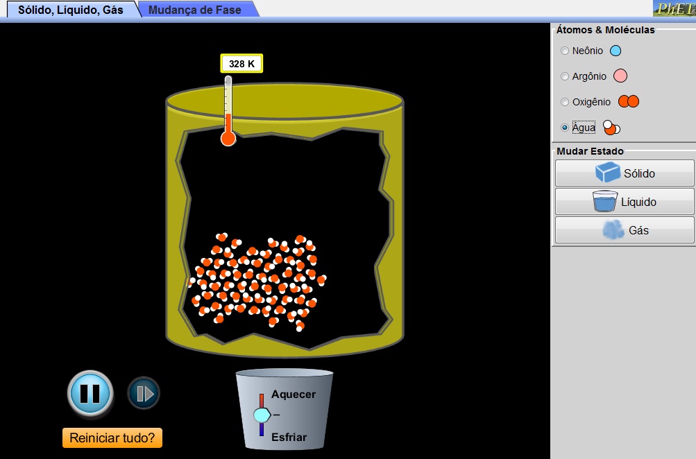 Esta simulação descreve as características dos três estados da matéria: sólido, líquido e gás. Sendo possível comparar partículas em três diferentes fases e verificar