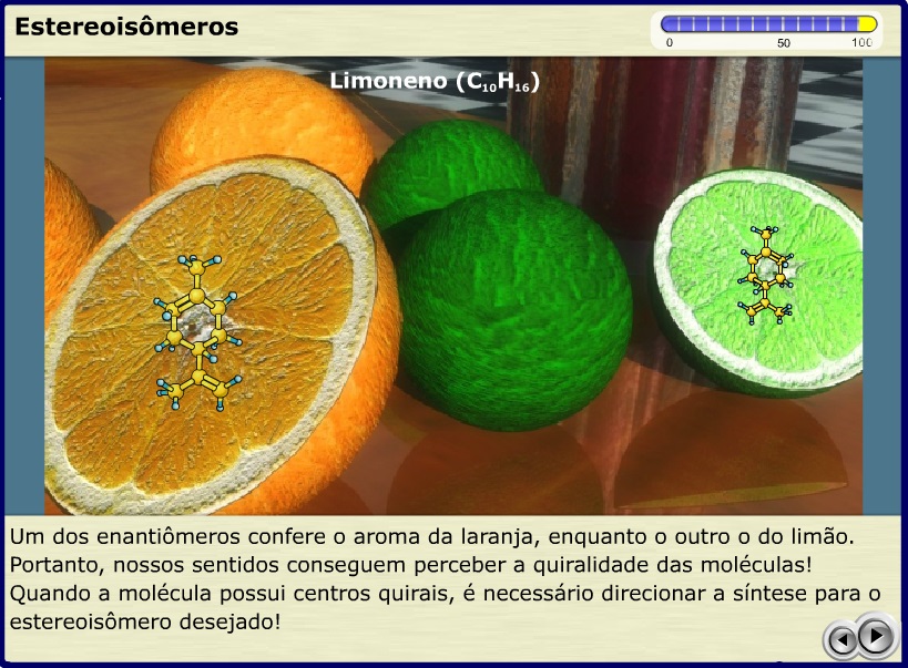 Apresenta animação que explica o conceito de estereoisomerismo. Estereisomêros são moléculas que apresentam a mesma fórmula molecular, cujo os átomos estão ligados na