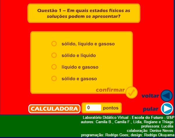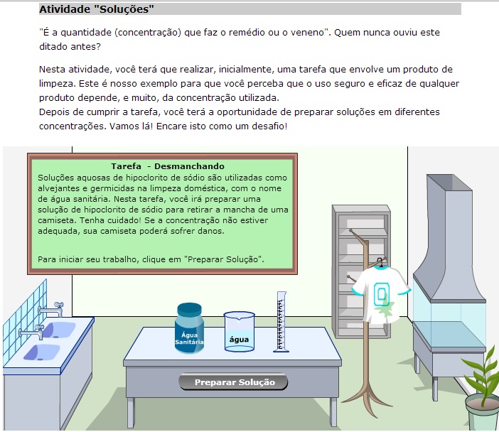 Simulação que traz um jogo onde o aluno pode testar seus conhecimentos sobre soluções. O objetivo é acumular pontos para, ao final, ganhar seu diploma