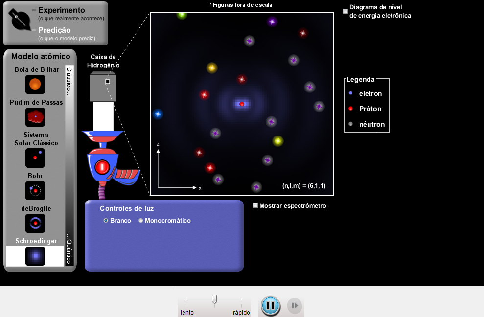 Como os cientistas descobriram a estrutura dos átomos sem olhar para eles? Experimente vários modelos de disparo de luz sobre o átomo. Verifique como a predição do modelo