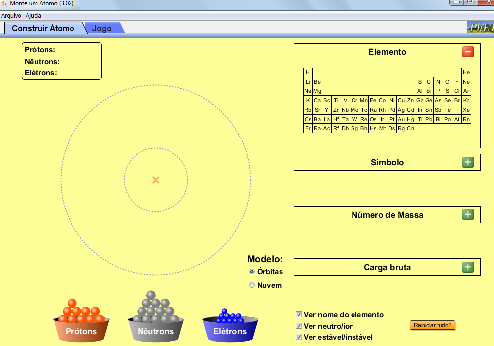 Simulador que permite montar um átomo a partir de suas partículas fundamentais (prótons, neutrons e eletrons), identificando o elemento químico e visualizando seus parâmetros