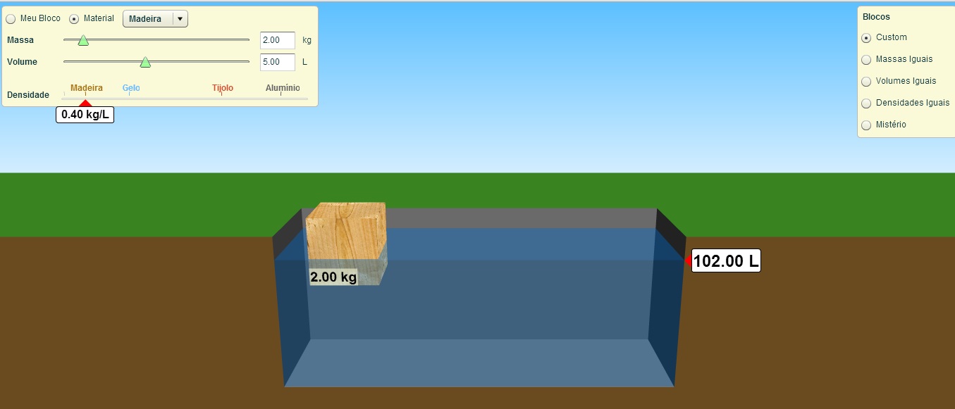 Esta simulação demonstra, por meio da flutuação em água, a relação entre a densidade de corpos, suas massas e volumes.