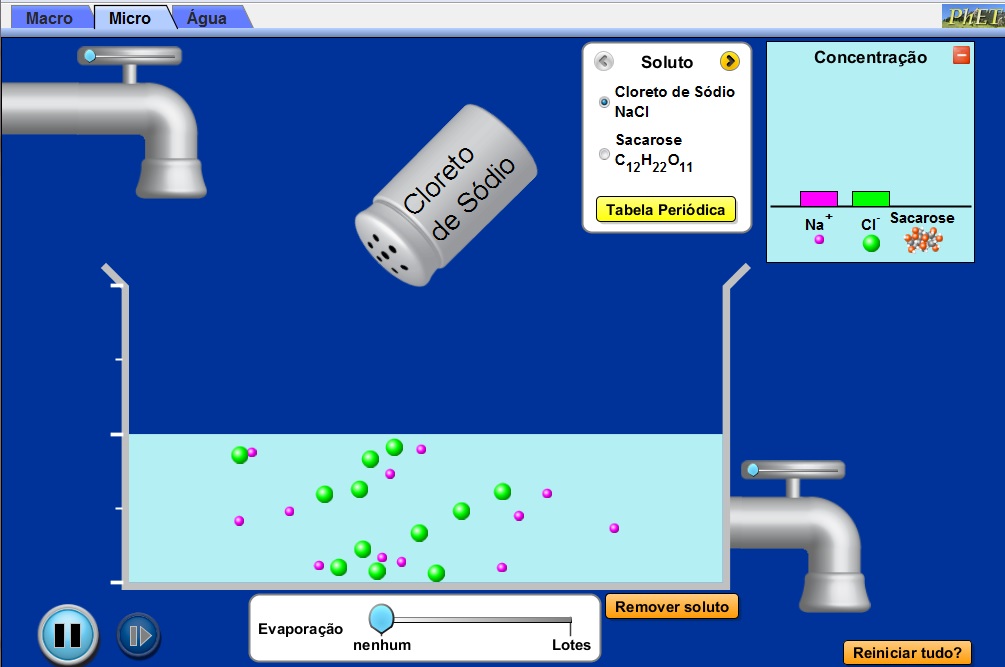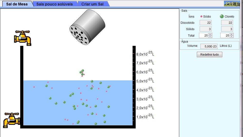 Esta simulação permite discutir a solubilidade de diferentes sais em água, avaliar a quantidade de cátions e ânions dissolvidos e não dissolvidos, em volume pré-determinado